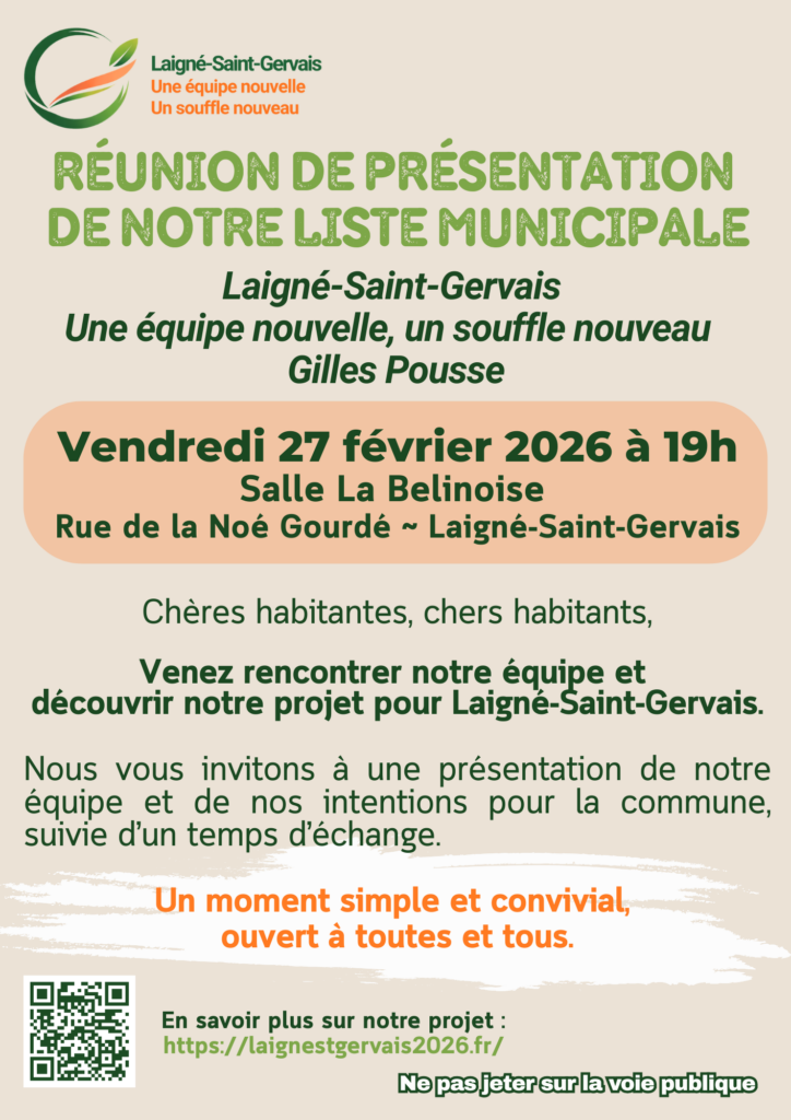 “Laigné-Saint-Gervais mérite une équipe proche de ses habitants, attentive à chacun et guidée par le bon sens. Avec mes colistiers, je m’engage pour une commune qui rassemble, où chacun a sa place et où les décisions collégiales sont prises avec clarté et respect. Nous voulons agir simplement, dans l’intérêt général, pour améliorer le quotidien et préparer l’avenir, ensemble et sans opposer.”